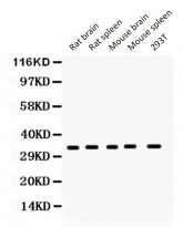Western blot: Rat brain, Rat spleen, Mouse brain, Mouse spleen and 293T whole cell lysates stained with ARG59186 anti-CCS / SOD4 antibody at 0.5 µg/ml dilution.