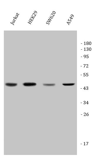 Western blot: Jurkat, HEK29, SW620, and A549 stained with ARG45188 anti-CDC123 antibody at 0.5 μg/ml dilution.