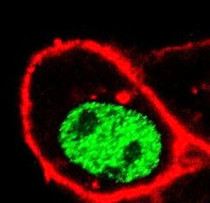 Immunofluorescence: HeLa cells stained with ARG59493 anti-CDC73 / Parafibromin antibody (green). Actin filaments have been labeled with Alexa Fluor 555 phalloidin (red).