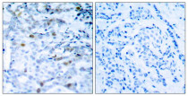 Immunohistochemistry: Paraffin-embedded Human breast carcinoma tissue stained with ARG51635 anti-CDK1 / CDC2 phospho (Thr161) antibody (left) or the same antibody preincubated with blocking peptide (right).
