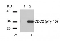Western blot: Extracts from HeLa cells untreated(lane 1) or treated with UV(lane 2) stained with ARG51731 anti-CDK1 / CDC2 phospho (Tyr15) antibody.