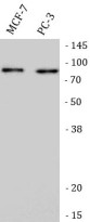 Western blot: MCF-7 and PC-3 stained with ARG45701 anti-CENPB antibody at 0.5 μg/ml dilution.