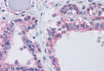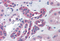Immunohistochemistry: Paraffin-embedded Human kidney tissue. Antigen Retrieval: Steam tissue section in Citrate buffer (pH 6.0). The tissue section was stained with ARG64931 anti-CENTG1 / PIKE antibody at 3.75 µg/ml dilution followed by AP-staining.