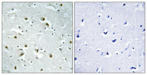 Immunohistochemistry: Paraffin-embedded Human brain tissue stained with ARG66605 anti-CEP135 antibody at 1:100 dilution (4°C, overnight). Antigen Retrieval: High-pressure and temperature Tris-EDTA buffer (pH 8.0). Negative control (right) was pre-absorbed by immunogen peptide.