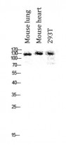 Western blot: Mouse lung, Mouse heart and 293T cell lysates stained with ARG66605 anti-CEP135 antibody at 1:1000 dilution.