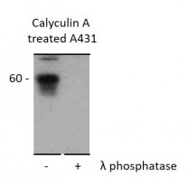 Western blot: A431 cells treated with Calyculin A (100 nM) for 30 min (left) before treatment with lambda phosphatase (right). The blots were stained with ARG40149 anti-CORO1B phospho (Ser2) antibody.