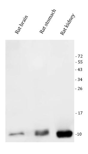Western blot: Rat brain, rat stomach, and rat kidney stained with ARG45189 anti-COX8A antibody at 0.5 μg/ml dilution.