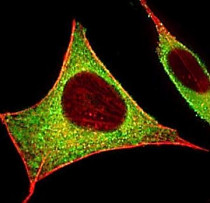 Immunofluorescence: 4% paraformaldehyde-fixed, 0.1% Triton X-100 permeabilized SH-SY5Y cells stained with ARG40127 anti-CRMP5 antibody (green) at 1:25 dilution. Cytoplasmic actin is detected with Dylight® 554 Phalloidin at 1:100 dilution (red).