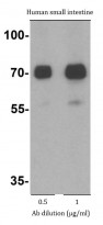 Western blot: Human small intestine lysates stained with ARG42593 anti-CRTC2 / TORC2 antibody at 0.5 and 1 µg/ml dilution.