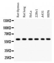 Western blot: 50 µg of Rat thymus, 50 µg of Rat lung, 40 µg of HeLa, 40 µg of 22Rv1, 40 µg of A431 and 40 µg of HEPA whole cell lysates stained with ARG42084 anti-CYP24A1 antibody at 0.5 µg/ml dilution.
