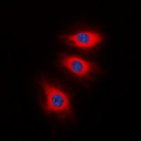Immunofluorescence: Formalin-fixed HeLa cells were permeabilized with 0.1% Triton X-100 in TBS for 5-10 minutes and blocked with 3% BSA-PBS for 30 minutes at room temperature. Cells were stained with ARG66533 anti-Caldesmon phospho (Ser789) antibody (red) in 3% BSA-PBS and incubated overnight at 4°C in a hidified chamber. DAPI (blue) for nuclear staining.