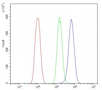 Flow Cytometry: PC-3 cells were blocked with 10% normal goat serum and then stained with ARG40279 anti-Calpain 1 antibody (blue) at 1 µg/10^6 cells for 30 min at 20°C, followed by incubation with DyLight®488 labelled secondary antibody. Isotype control antibody (green) was rabbit IgG (1 µg/10^6 cells) used under the same conditions. Unlabelled sample (red) was also used as a control.