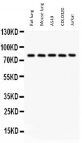 Western blot: 50 µg of Rat lung, 50 µg of Mouse lung, 40 µg of A549, 40 µg of COLO320 and 40 µg of Jurkat whole cell lysates stained with ARG40279 anti-Calpain 1 antibody at 0.5 µg/ml dilution.