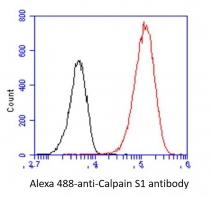 Flow Cytometry: HeLa cell line stained with ARG57147 anti-Calpain S1 antibody [1D11] at 2-5 µg for 1x10^6 cells (red line). Secondary antibody: Goat anti-Mouse IgG Alexa fluor 488 conjugate. Isotype control antibody: Mouse IgG (black line).