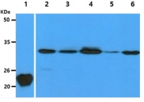 Western blot: 50 ng of 1) CAPNS1 recombinant proteins, 40 µg of 2) HeLa, 3) A431, 4) 293T, 5) Balb/3T3, and 6) U87MG cell lysates stained with ARG57147 anti-Calpain S1 antibody [1D11] at 1:1000.