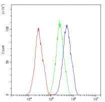 Flow Cytometry: HepG2 cells were blocked with 10% normal goat serum and then stained with ARG43230 anti-Caspase 3 antibody [8B6] (blue) at 1 µg/10^6 cells for 30 min at 20°C, followed by incubation with DyLight®488 labelled secondary antibody. Isotype control antibody (green) was mouse IgG (1 µg/10^6 cells) used under the same conditions. Unlabelled sample (red) was also used as a control.