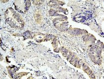 Immunohistochemistry: Paraffin-embedded Human intestinal cancer tissue. Antigen Retrieval: Heat mediation was performed in EDTA buffer (pH 8.0). The tissue section was blocked with 10% goat serum. The tissue section was then stained with ARG43230 anti-Caspase 3 antibody [8B6] at 1 µg/ml dilution, overnight at 4°C.