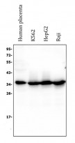 Western blot: 50 µg of sample under reducing conditions. Human placenta, K562, HepG2 and Raji whole cell lysates stained with ARG43230 anti-Caspase 3 antibody [8B6] at 0.5 µg/ml dilution, overnight at 4°C.