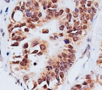 Immunohistochemistry: Formaldehyde fixed and Paraffin-embedded Human colon cancer tissue. Antigen Retrieval: Heat mediation was performed in Citrate buffer. The sample was blocked and stained with ARG43301 anti-Caspase 3 phospho (Ser150) antibody at 1:50 dilution, for 1.5 hours at 22°C.