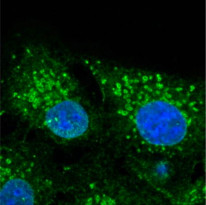 Immunofluorescence: NIH/3T3 cells were fixed with methanol and permeabilized with 0.1% Saponin. Cells were stained with ARG42497 anti-Caveolin 2 antibody (green) at 1:100 dilution. Nuclear staining (blue).