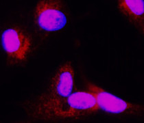 Immunofluorescence: HuVEC cells were fixed with 4% paraformaldehyde at RT for 10 min, permeabilized with 0.1% NP-40 at RT for 10 min and then cells were blocked with 5% BSA at RT for 30 min and stained with ARG66962 anti-Cyclin A2 antibody (red) at 1:200 dilution at 4°C for overnight. DAPI (blue) was used for nuclear staining.