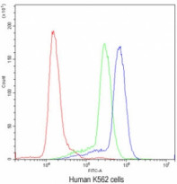 Flow Cytometry: K562 cells stained with ARG58019 anti-Cyclin D3 antibody at 1 µg/10^6 cells (blocked with goat sera). Red: Cells alone, Green: Isotype control, Blue: Primary antibody.