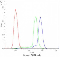 Flow Cytometry: Human THP1 cells stained with ARG58019 anti-Cyclin D3 antibody at 1 µg/10^6 cells (blocked with goat sera). Red: Cells alone, Green: Isotype control, Blue: Primary antibody.