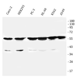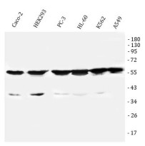 Western blot: Caco-2, HEK293, PC-3, HL-60, K562,and A549 stained with ARG45159 anti-SCN4B antibody at 0.5 μg/ml dilution.