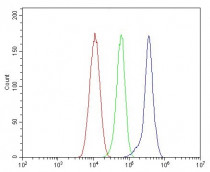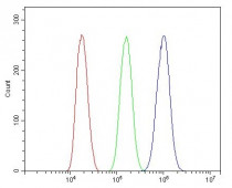 Flow Cytometry: HEPA1-6 cells were blocked with 10% normal goat serum and then stained with ARG42023 anti-DAZL antibody (blue) at 1 µg/10^6 cells for 30 min at 20°C, followed by incubation with DyLight®488 labelled secondary antibody. Isotype control antibody (green) was Rabbit IgG (1 µg/10^6 cells) used under the same conditions. Unlabelled sample (red) was also used as a control.