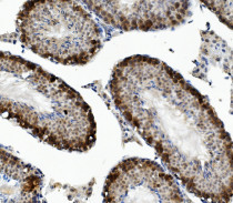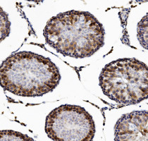 Immunohistochemistry: Paraffin-embedded Mouse testis cancer tissue. Antigen Retrieval: Heat mediation was performed in EDTA buffer (pH 8.0). The tissue section was blocked with 10% goat serum. The tissue section was then stained with ARG42023 anti-DAZL antibody at 1 µg/ml dilution, overnight at 4°C.