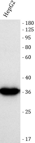 Western blot: HepG2 stained with ARG45478 anti-DDAH1 antibody at 0.5 μg/ml dilution.