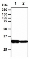 Western blot: 40 µg of 1) PC3, and 2) HepG2 cell lysates stained with ARG57171 anti-DECR1 antibody [3B2] at 1:1000.