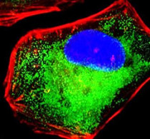 Immunofluorescence: 4% paraformaldehyde-fixed, 0.1% Triton X-100 permeabilized HeLa cells stained with ARG59736 anti-DENR antibody (green) at 1:25 dilution. Cytoplasmic actin is detected with Dylight® 554 Phalloidin (red) at 1:100 dilution. The nuclear counter stain is DAPI (blue).