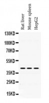 Western blot: 30 µg of sample under reducing conditions. Rat liver, Mouse spleen and HepG2 whole cell lysates stained with ARG43427 anti-DHODH antibody at 0.5 µg/ml dilution, overnight at 4°C.