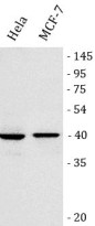 Western blot: Hela and MCF-7 stained with ARG45745 anti-DHPS antibody at 0.5 μg/ml dilution.