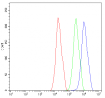 Flow Cytometry: HepG2 cells were blocked with 10% normal Goat serum and then stained with ARG41567 anti-DMD / Dystrophin antibody (blue) at 1 µg/10^6 cells for 30 min at 20°C, followed by incubation with DyLight®488 labelled secondary antibody. Isotype control antibody (green) was Rabbit IgG (1 µg/10^6 cells) used under the same conditions. Unlabelled sample (red) was also used as a control.