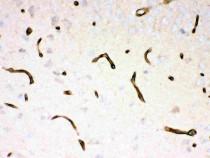 Immunohistochemistry: Paraffin-embedded Mouse brain tissue. Antigen Retrieval: Heat mediation was performed in Citrate buffer (pH 6.0, epitope retrieval solution) for 20 min. The tissue section was blocked with 10% goat serum. The tissue section was then stained with ARG41567 anti-DMD / Dystrophin antibody at 1 µg/ml dilution, overnight at 4°C.