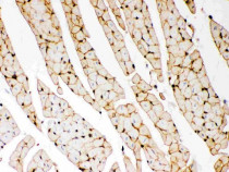 Immunohistochemistry: Paraffin-embedded Rat cardiac muscle tissue. Antigen Retrieval: Heat mediation was performed in Citrate buffer (pH 6.0, epitope retrieval solution) for 20 min. The tissue section was blocked with 10% goat serum. The tissue section was then stained with ARG41567 anti-DMD / Dystrophin antibody at 1 µg/ml dilution, overnight at 4°C.