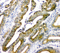 Immunohistochemistry: Paraffin-embedded Human intestinal cancer tissue. Antigen Retrieval: Heat mediation was performed in Citrate buffer (pH 6.0) for 20 min. The tissue section was blocked with 10% goat serum. The tissue section was then stained with ARG43127 anti-DOK7 antibody at 1 µg/ml dilution, overnight at 4°C.
