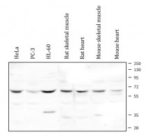 Western blot: 50 µg of sample under reducing conditions. HeLa, PC-3, HL-60, Rat skeletal muscle, Rat heart, Mouse skeletal muscle and Mouse heart lysates stained with ARG43127 anti-DOK7 antibody at 0.5 µg/ml dilution, overnight at 4°C.