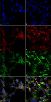 Immunofluorescence: 5% Formaldehyde fixed (5 min) HEK293 cells stained with ARG22625 anti-Dityrosine antibody [10A6] at 1:50 for 30 - 60 min at RT. Secondary Antibody: Goat anti-Mouse (Alexa Fluor 488) at 1:1500 for 30 - 60 min at RT. Counterstain: Phalloidin Alexa Fluor 633 F-Actin stain; DAPI (blue) nuclear stain. (A,C,E,G) Untreated. (B,D,F,H) Cells cultured overnight with 50 µM H2O2. (A,B) DAPI (blue) nuclear stain. (C,D) Phalloidin Alex Fluor 633 F-Actin stain. (E,F) Primary antibody. (G,H) Composite.