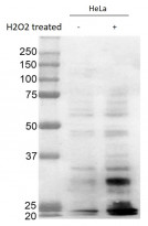 Western blot: 12 µg of HeLa cell lysate and H2O2 treated HeLa cell lysate stained with ARG22625 anti-Dityrosine antibody [10A6] at 1:1000 for 2 hours at RT.