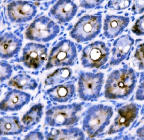 Immunohistochemistry: Mouse colon stained with ARG45419 anti-Duox2 antibody at 2 μg/ml dilution.