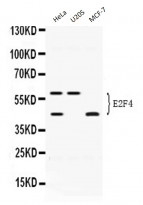 Western blot: HeLa, U20S and MCF-7 whole cell lysates stained with ARG58513 anti-E2F4 antibody at 0.5 µg/ml dilution.