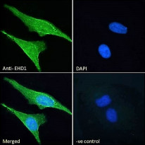 Immunofluorescence: Paraformaldehyde fixed HeLa cells permeabilized with 0.15% Triton. Cells were stained with ARG42140 anti-EHD1 antibody (green) at 10 µg/ml dilution for 1 hour. DAPI (blue) for nuclear staining. Negative control: Unimmunized Goat IgG at 10 µg/ml dilution.