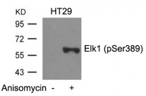 Western blot: Extracts from HT29 cells untreated or treated with Anisomycin stained with ARG51541 anti-ELK1 phospho (Ser389) antibody.