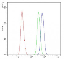 Flow Cytometry: U2OS cells were blocked with 10% normal goat serum and then stained with ARG59464 anti-EME1 antibody (blue) at 1 µg/10^6 cells for 30 min at 20°C, followed by incubation with DyLight®488 labelled secondary antibody. Isotype control antibody (green) was rabbit IgG (1 µg/10^6 cells) used under the same conditions. Unlabelled sample (red) was also used as a control.