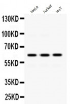 Western blot: 40 µg of HeLa, Jurkat and HuT whole cell lysates stained with ARG59464 anti-EME1 antibody at 0.5 µg/ml dilution.
