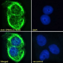 Immunofluorescence: Paraformaldehyde-fixed U2OS cells permeabilized with 0.15% Triton. Cells were stained with ARG64370 anti-EPB41L2 / 4.1G antibody (green) at 10 µg/ml dilution for 1 hour. DAPI (blue) for nuclear staining. Negative control: Unimmunized goat IgG (green) at 10 µg/ml dilution.
