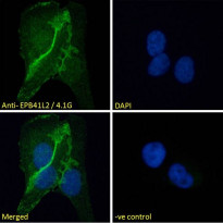 Immunofluorescence: Paraformaldehyde-fixed A431 cells permeabilized with 0.15% Triton. Cells were stained with ARG64370 anti-EPB41L2 / 4.1G antibody (green) at 10 µg/ml dilution for 1 hour. DAPI (blue) for nuclear staining. Negative control: Unimmunized goat IgG (green) at 10 µg/ml dilution.